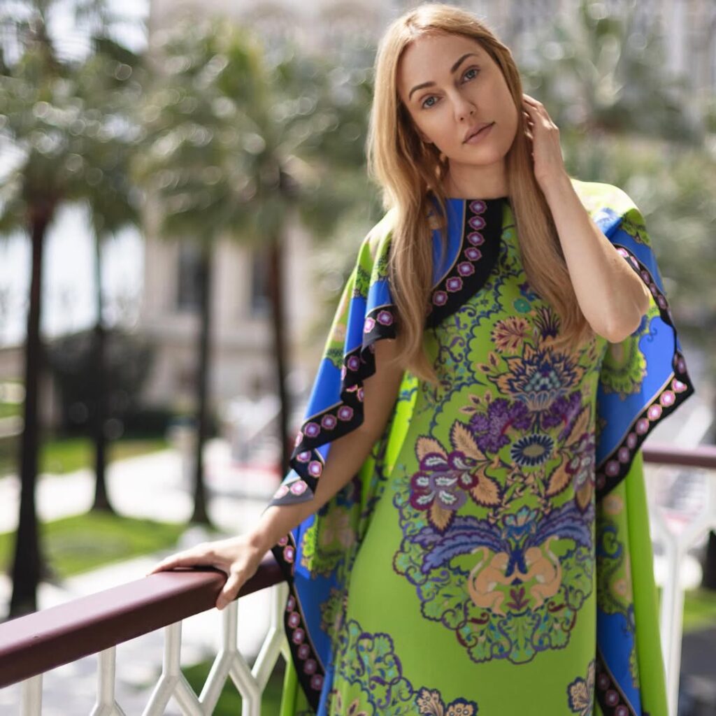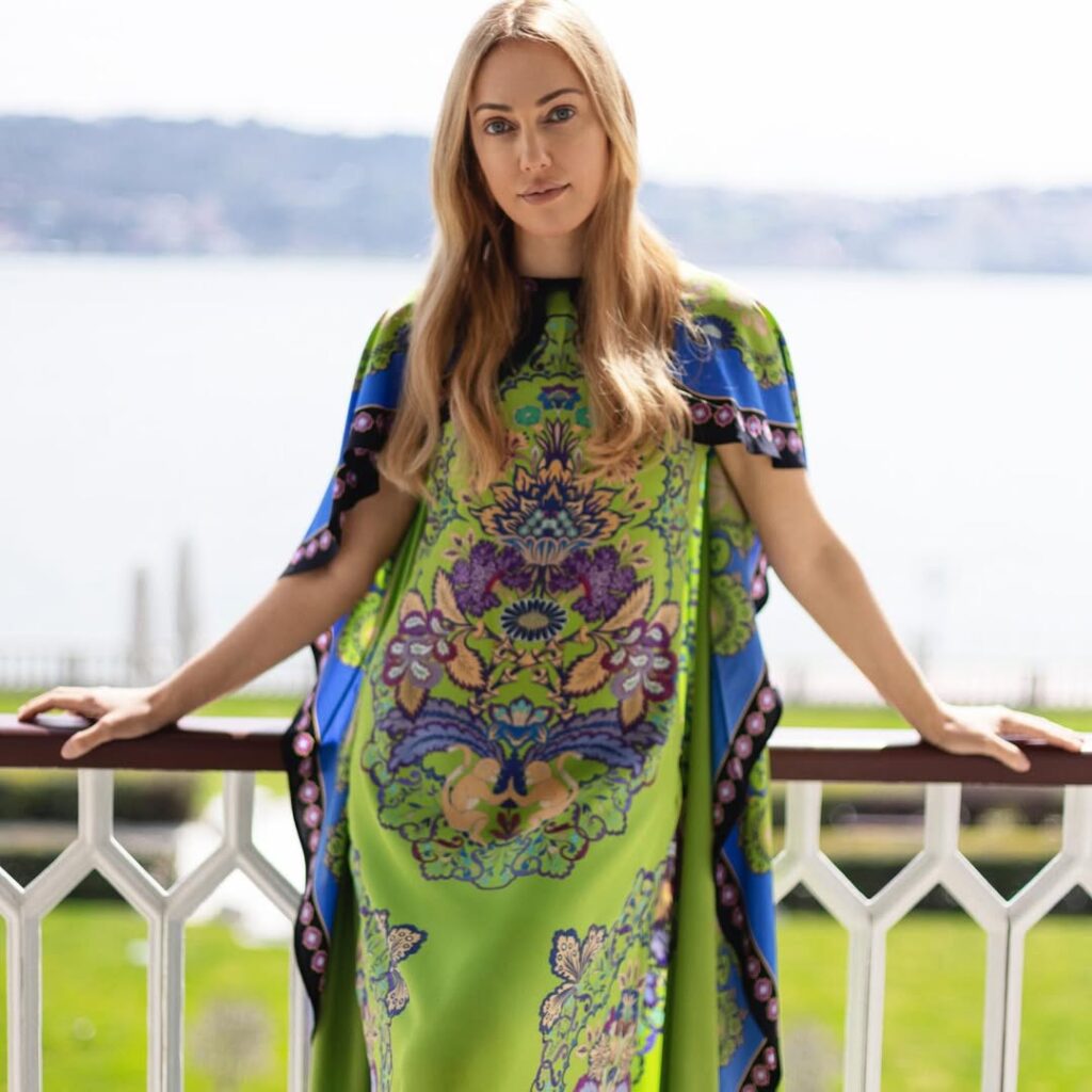 جاء الفستان باللون الأخضر الزاهي، مع تداخل ألوان نابضة بالحياة من الأزرق والبنفسجي والبرتقالي، حيث برزت نقشة الورود بشكل جذاب يعكس أجواء الربيع. كما حمل التصميم طابعًا شرقيًا واضحًا من خلال قصته، خاصة مع الكاب المنسدل من الخلف بنفس اللون والنقشة. وتُعد هذه القصة تحديدًا من التصاميم المفضلة لدى أوزرلي، التي تميل إلى الإطلالات المنسدلة والغنية بالتفاصيل.