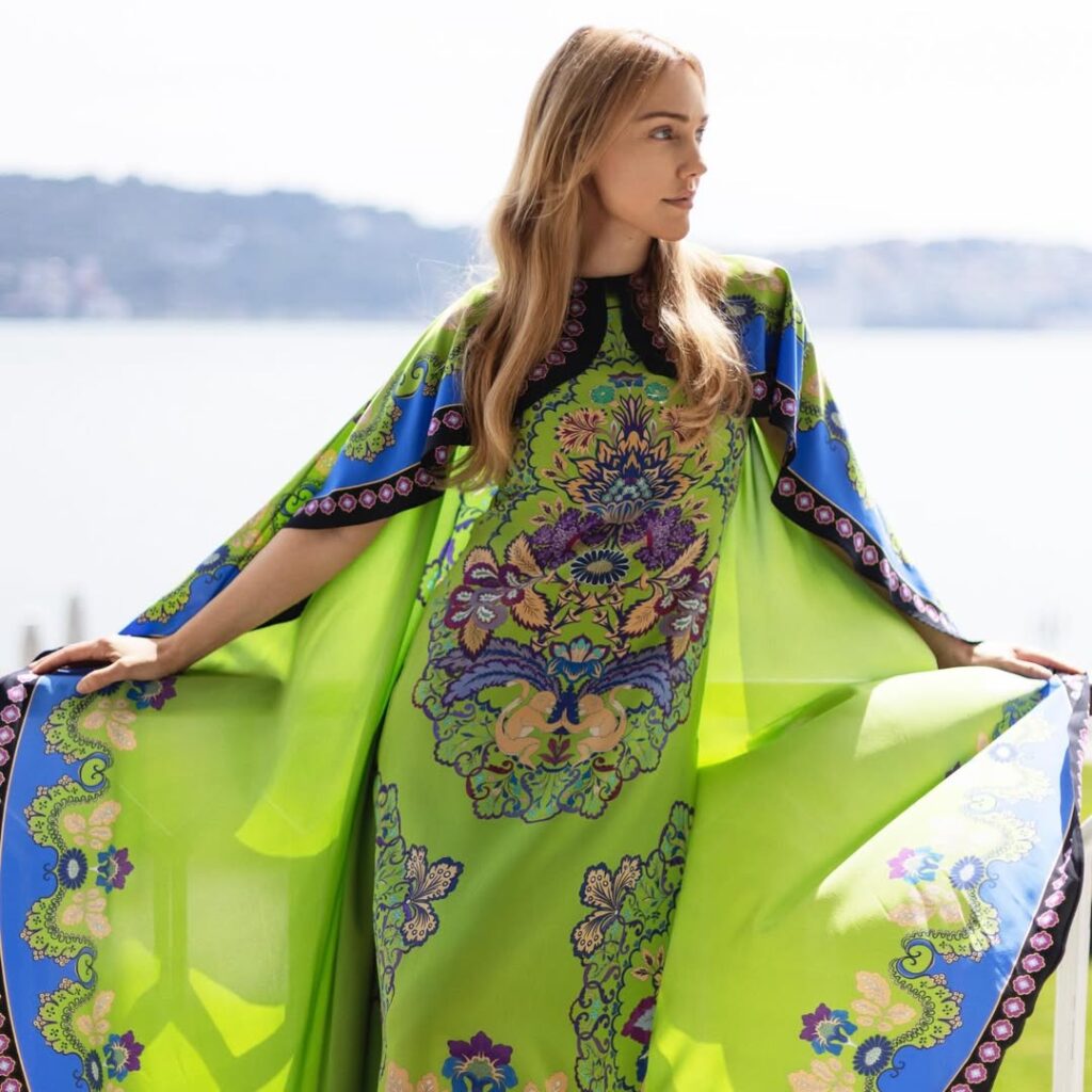 اختارت مريم أوزرلي فستان ماكسي من علامة لادوبليج La DoubleJ، وهو تصميم مصنوع في إيطاليا من قماش الحرير المطبوع بنقشات زهرية غنية بالألوان. يتميز الفستان بأكمام منسدلة بأسلوب الكاب، تضيف حركة وانسيابية لافتة.