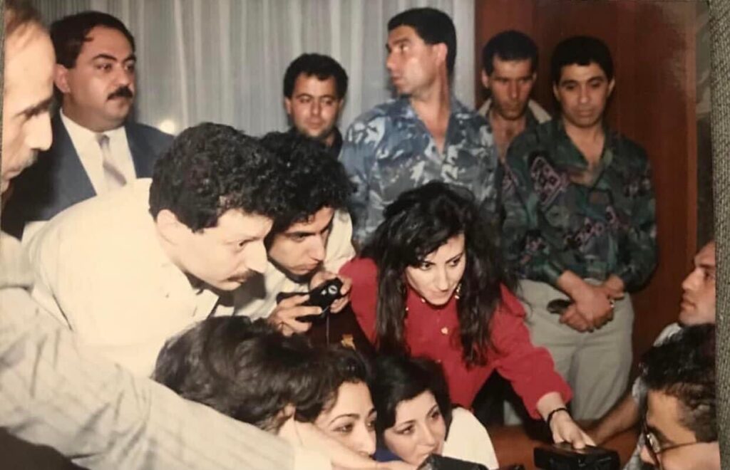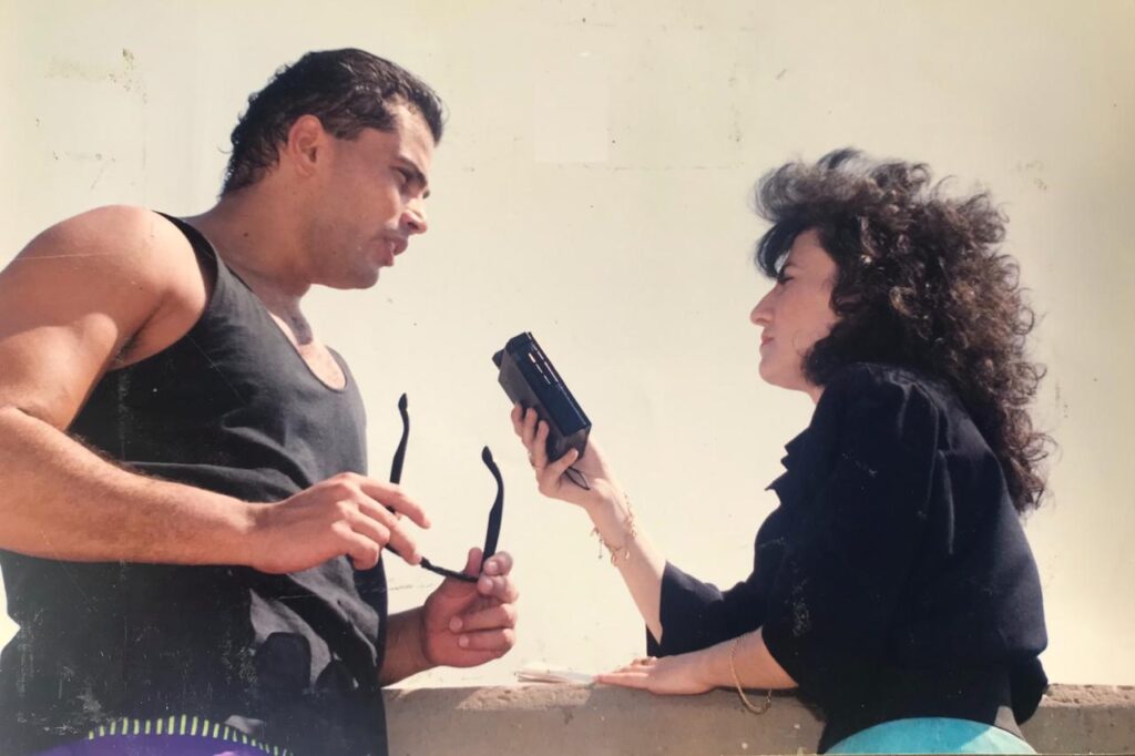 عام ١٩٩١ كانت زيارته الأولى وكان اللقاء الخاطف في صالون الشرف بمطار بيروت الدولي في مؤتمر مصغر مع زملاء أعزاء على هامشإحيائه حفلة غنائية في فندق “البريستول” حيث كانت لنا فرصة خاصة لتسجيل حوار قصير معه في اليوم التالي؛ تمت إذاعته في “راديوميوزك باور” مع أخي صاحب ومدير عام الإذاعة فؤاد كيالي وكنت أشغل وقتذاك منصب مديرة البرامج .